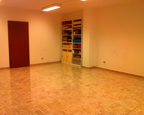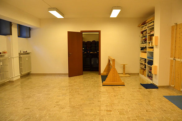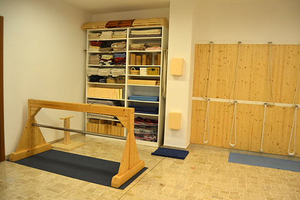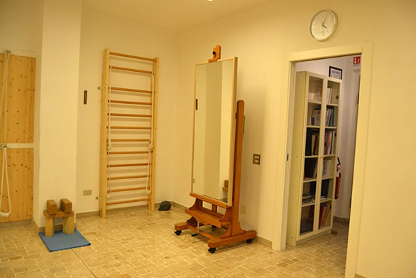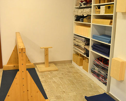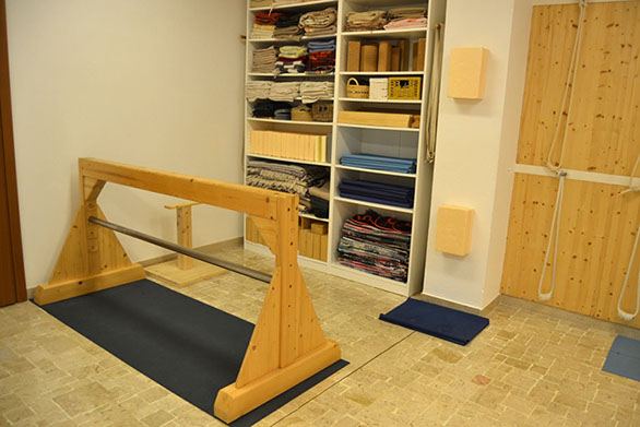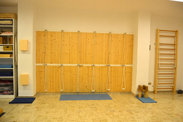 La sala è attrezzata per questo metodo yoga che prevede l’uso dei supporti. Sono quindi presenti in sala mattoni di legno, cinture, coperte, bolster (cuscinoni cilindrici), sedie e quant’altro risulta necessario alla pratica